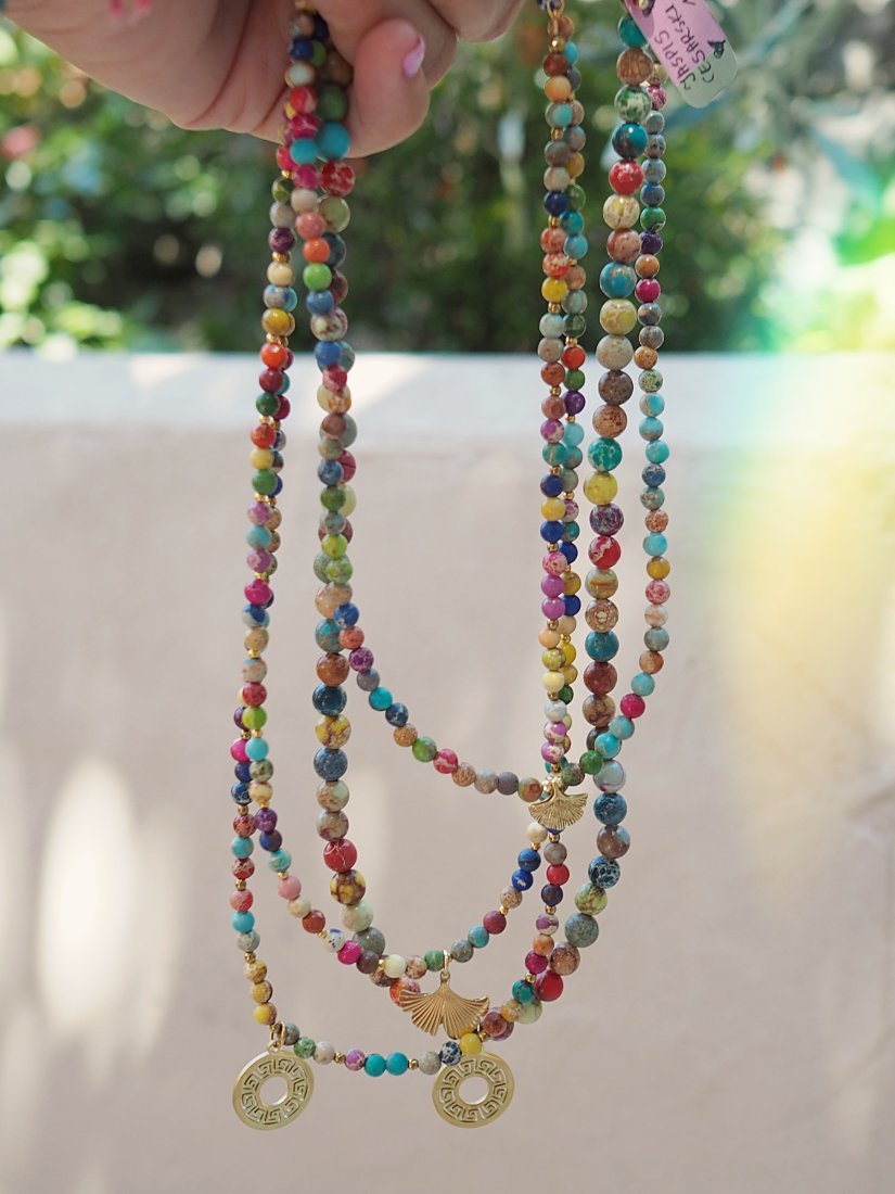 Kolorowy, energetyczny i piękny naszyjnik wykonany ręcznie z wielokolorowego jaspisu cesarskiego, który posiada charakterystyczne cętki i wzory w różnych odcieniach.