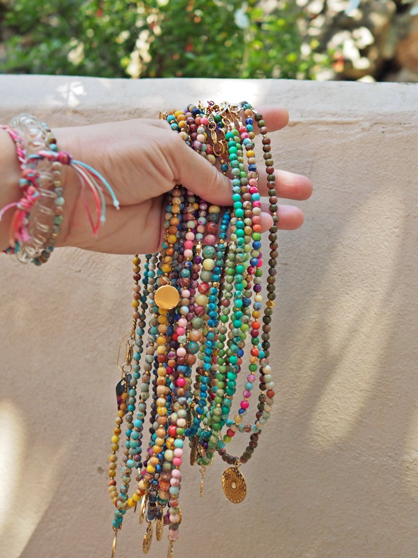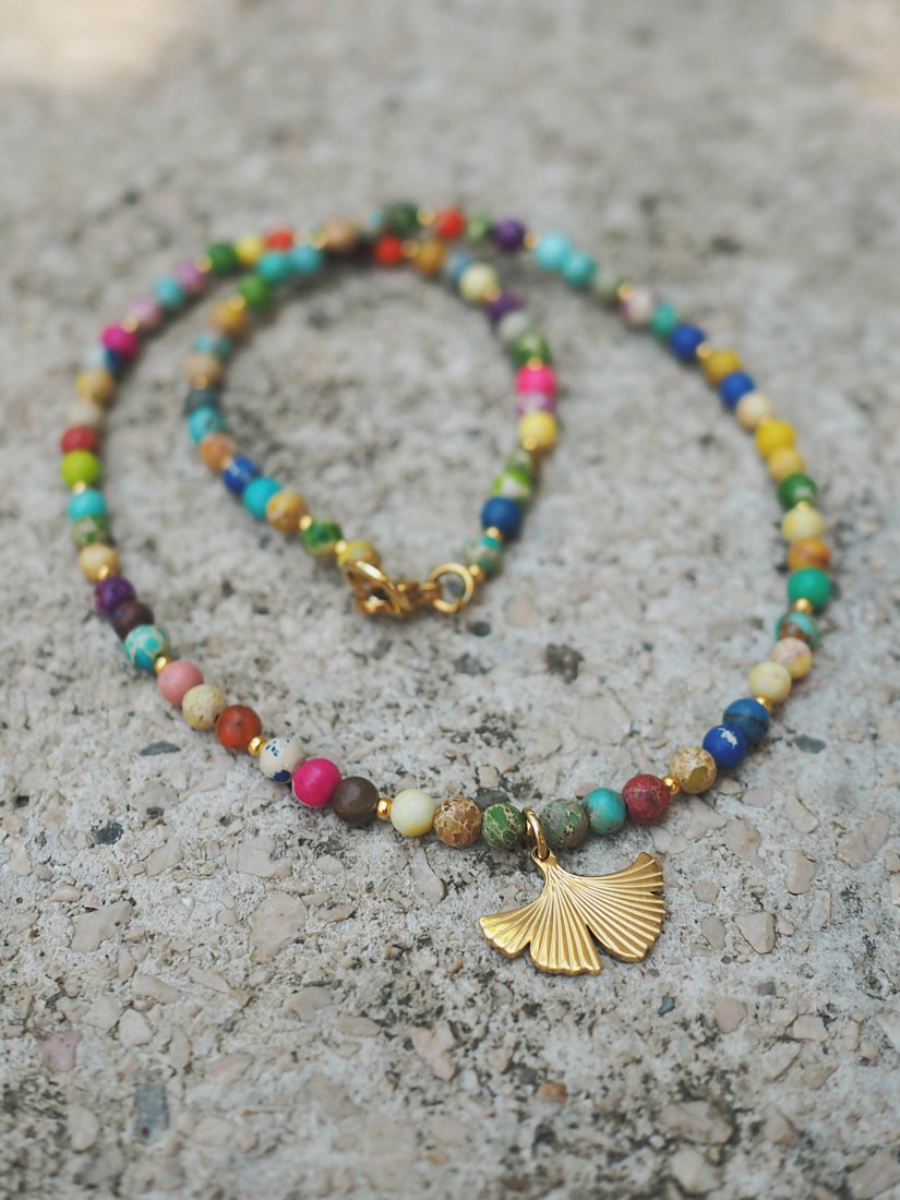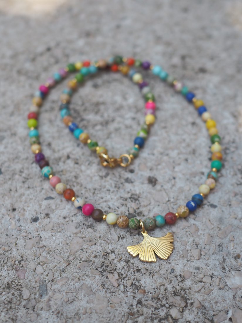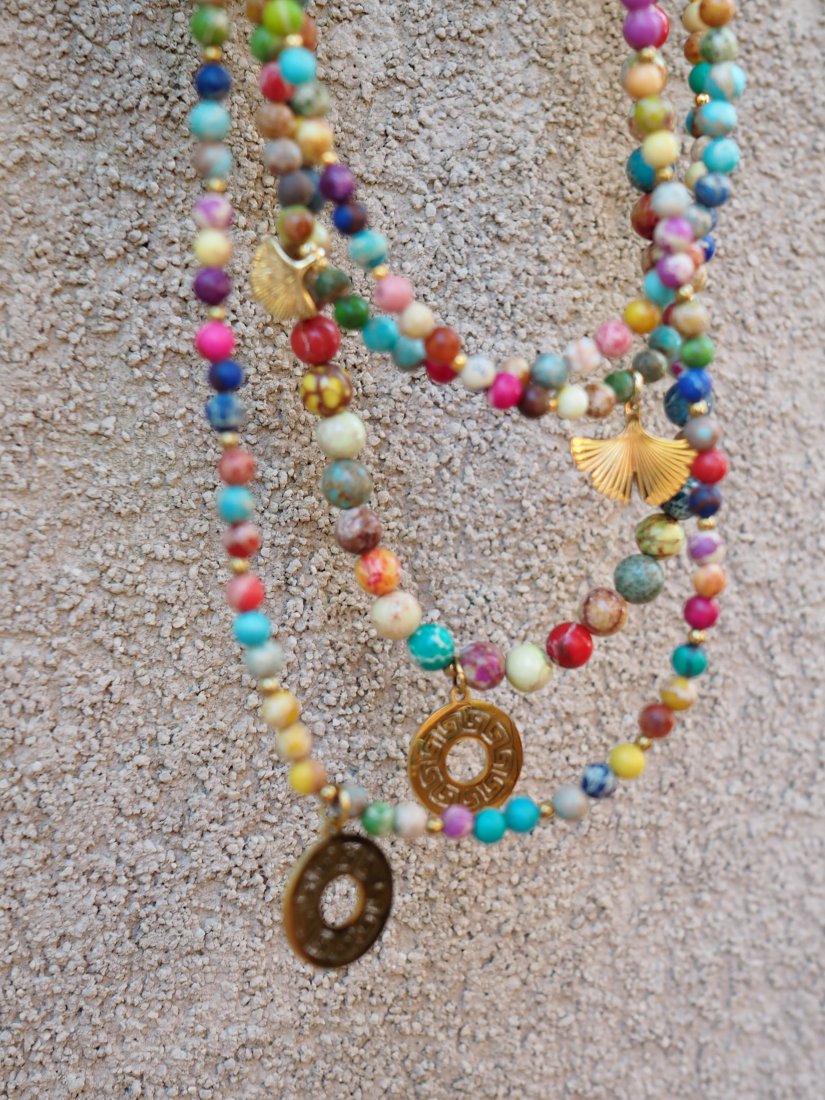 Kolorowy, energetyczny i piękny naszyjnik wykonany ręcznie z wielokolorowego jaspisu cesarskiego, który posiada charakterystyczne cętki i wzory w różnych odcieniach.