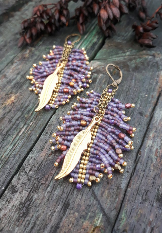 ,,liść we fiolecie,,to niezwykle kobiece kolczyki wykonane ze szklanych koralików i kryształków w różnych odcieniach matowego fioletu. Kolczyki zawieszone są na ozdobnych biglach typu angielskiego w kolorze mosiądzu.