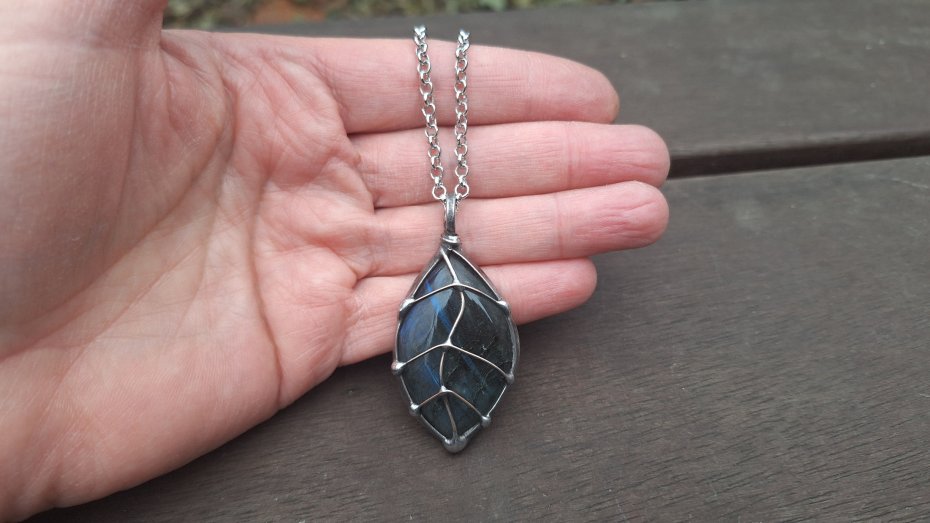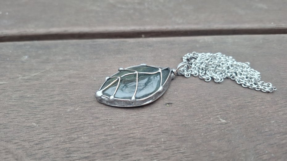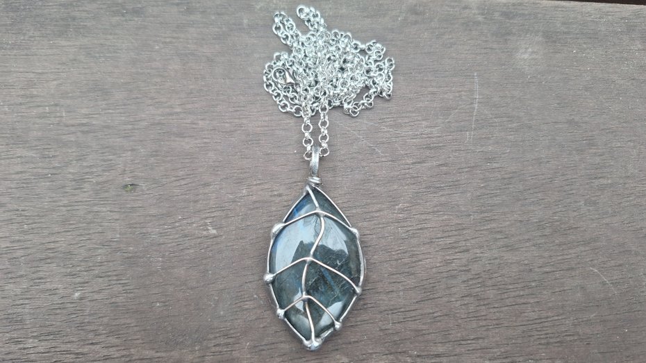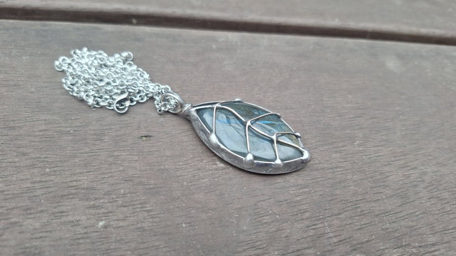 Wisiorek wykonany z miedzi, cyny i labradorytu. Wymiary ok. 4.5 na 2.5 cm. Zawieszony na łańcuszku o długości ok. 50 cm.