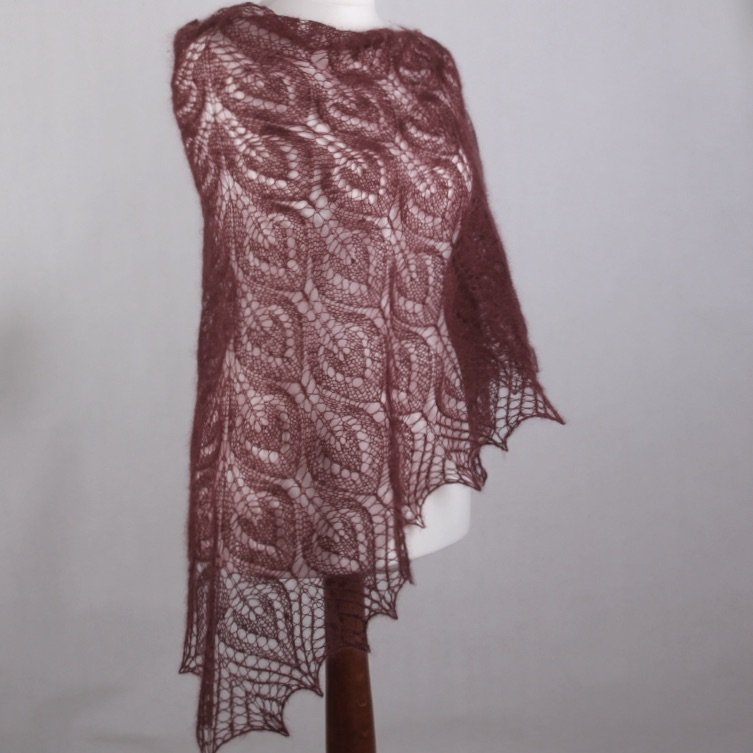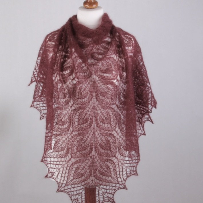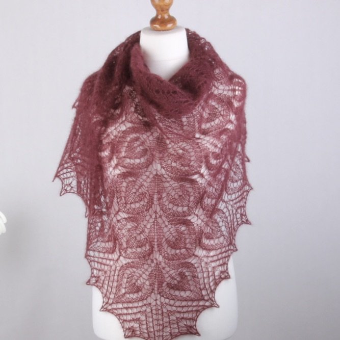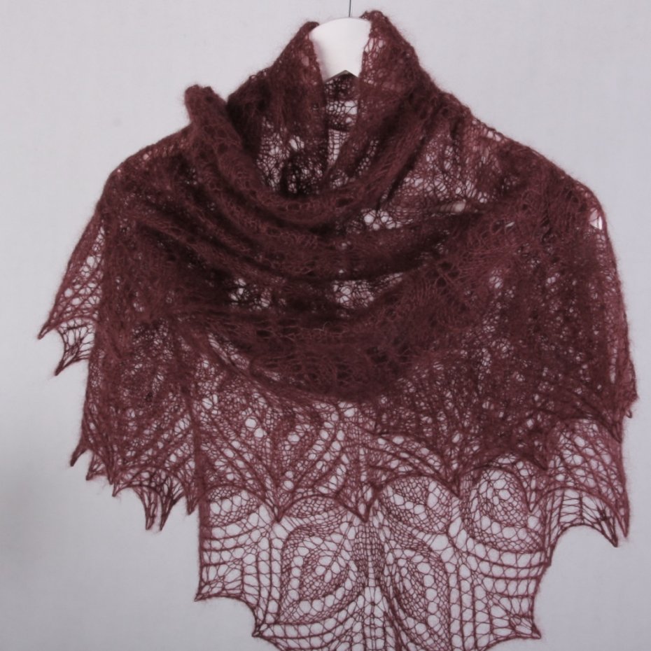 Ażurowa chusta wykonana na drutach z luksusowej włóczki moherowo-jedwabnej z dodatkiem bardzo cieniutkiego merino. Mieszanka ta daje niesamowitą delikatność, miękkość w połączeniu z lekkością. Chusta jest bardzo cieniutka i zwiewna., a jednocześnie przytulna i delikatna.