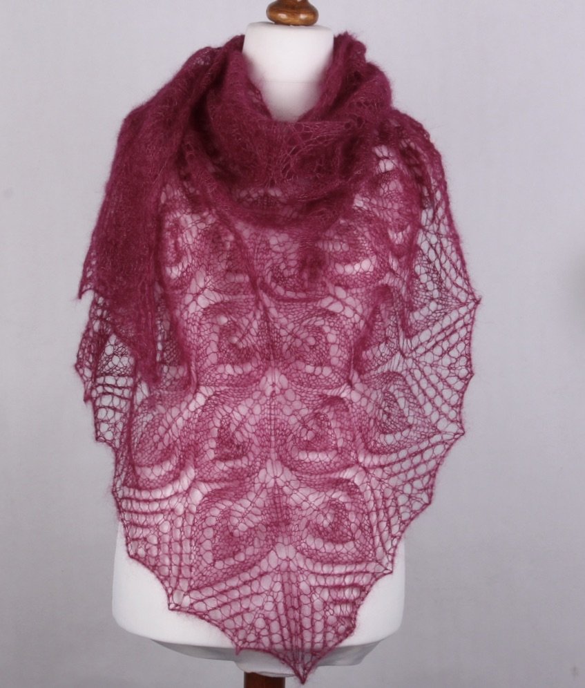 Ażurowa chusta wykonana na drutach z luksusowej włóczki moherowo-jedwabnej Mieszanka ta daje niesamowitą delikatność, miękkość w połączeniu z lekkością. Chusta jest bardzo cieniutka i zwiewna., a jednocześnie przytulna i delikatna. Obecność jedwabiu dodaje szlachetności.