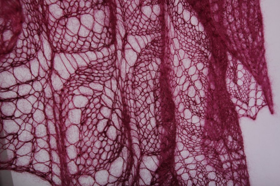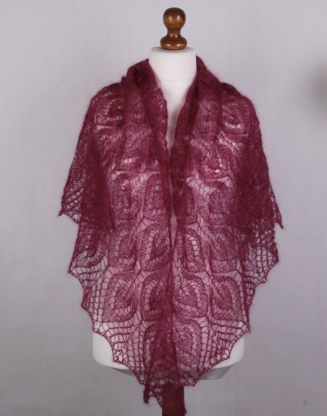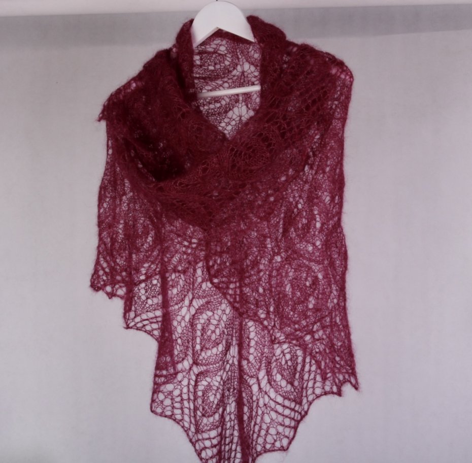 Ażurowe chusty mają w sobie nutę elegancji. Dzięki swojej elegancji i delikatności i lekkości, potrafi otulić gdy poczujemy chłód i niewątpliwie dodaje uroku wielu stylizacjom. Kolor wiśniowy.