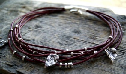 Ciekawy naszyjnik, wykonany z siedmiu skórzanych rzemieni w kolorze ciemnej czerwieni oraz elementów posrebrzanych i metalowych. Zapięcie stanowią posrebrzane haki wielkości 2,8 cm. Całkowita dł. naszyjnika 46 cm.