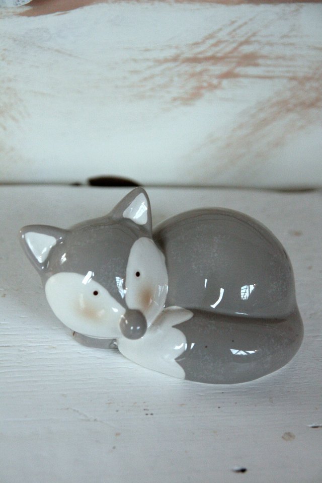 Uroczy, szary ceramiczny lisek leżący:) Może być niezobowiązującym upominkiem!