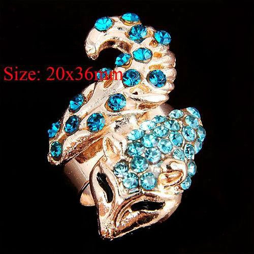 Korona pierścionka dekorowana licznymi cyrkoniami w dwóch odcieniach niebieskiego.