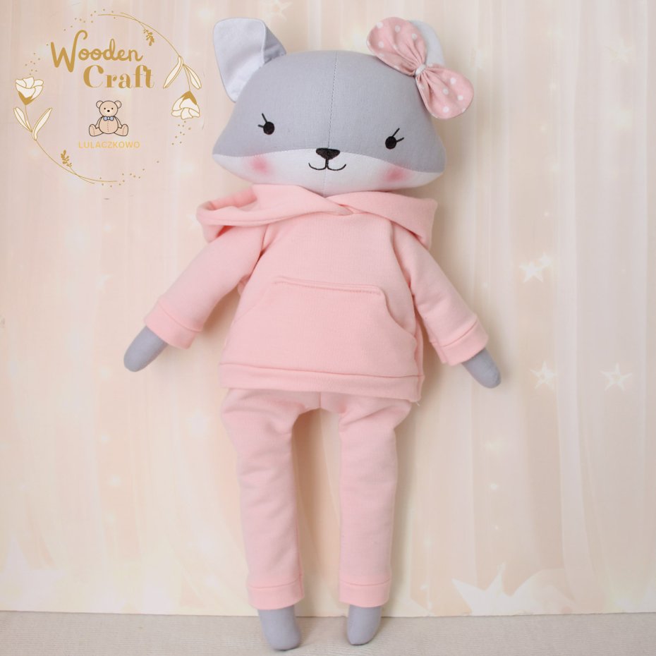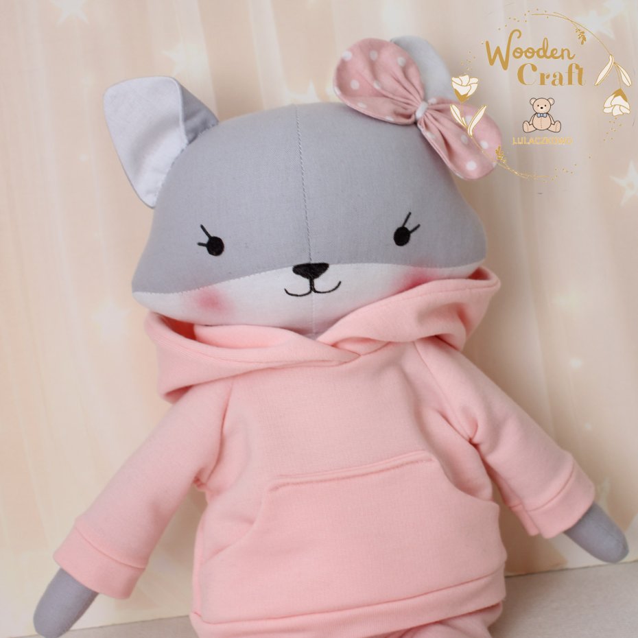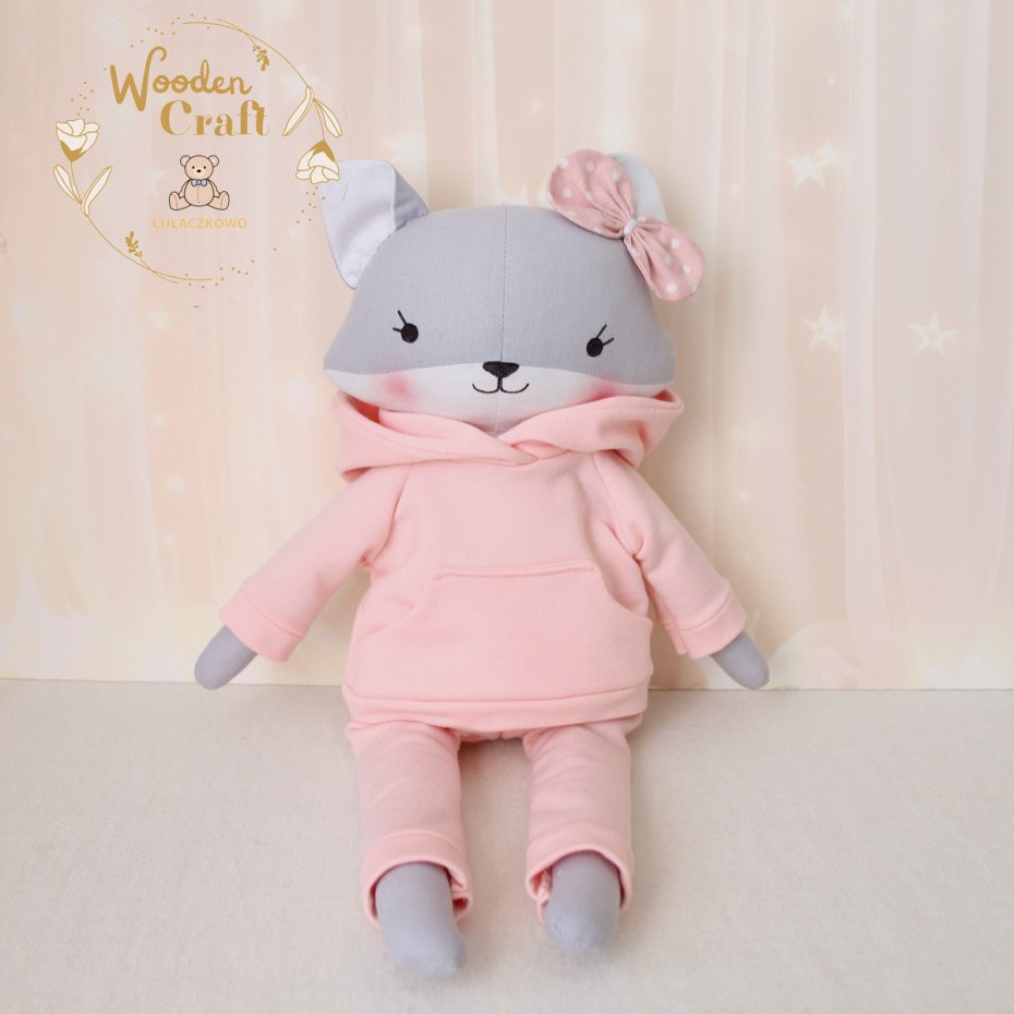 Przeurocza przytulanka, lisek a właściwie lisiczka w odcieniach szarości i bieli, uszyta ręcznie z najwyższą starannością, ubrana w śliczny, mięciutki dresik w kolorze pudrowego różu. Wykonana ze 100% bawełny, wypełniona antyalergiczną kulką silikonową. Oczka, nosek i uśmiech malowane wodoodpornym markerem, uszko ozdobione kokardką. Zarówno bluzę jak i spodenki od dresu można swobodnie zdejmować, posiadają gumeczkę. Górne i dolne łapki układają się luźno, lisiczka siedzi z podparciem.