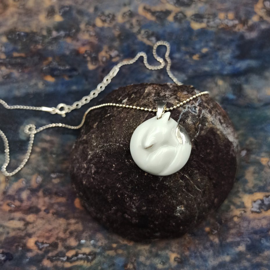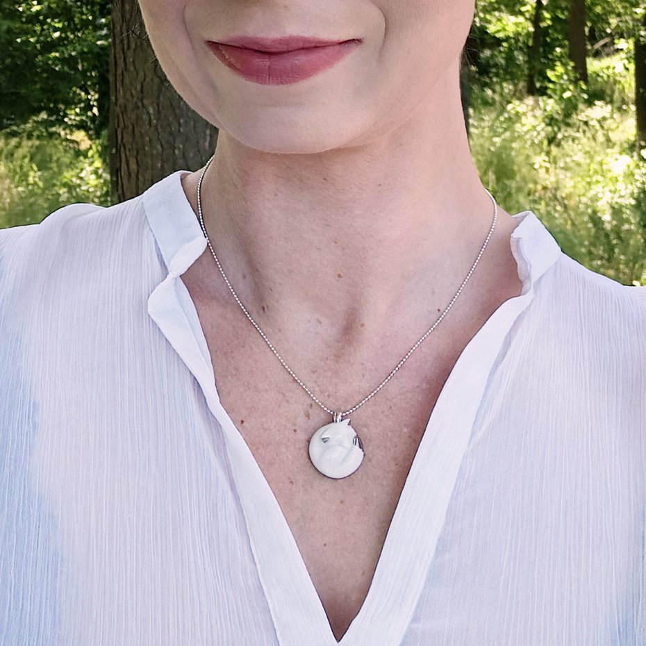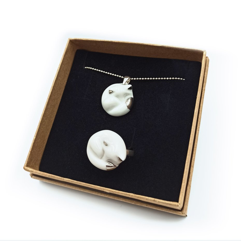 Pierścionek i wisiorek z liskiem o średnicy ok. 2 cm wykonany jest z porcelany szkliwionej ozdobionej platyną. Pierścionek waży ok. 7 g. Obrączka wykonana jest ze srebra próby 925. Rozmiar pierścionka jest uniwersalny dzięki regulacji. Jest elegancko wykończony z każdej strony.