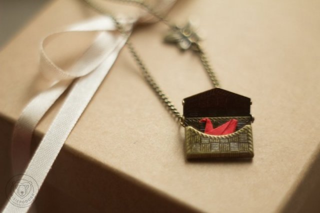 Naszyjnik w formie skarbnika. Papierowy żuraw ukryty w maleńkiej kopercie, o długości 2 cm. Część ozdobna zawieszona na łańcuszku o długości 36 cm. Całość w kolorze starego złota/brązu. Łańcuszek ozdobiony łącznikiem, w kształcie motylka.