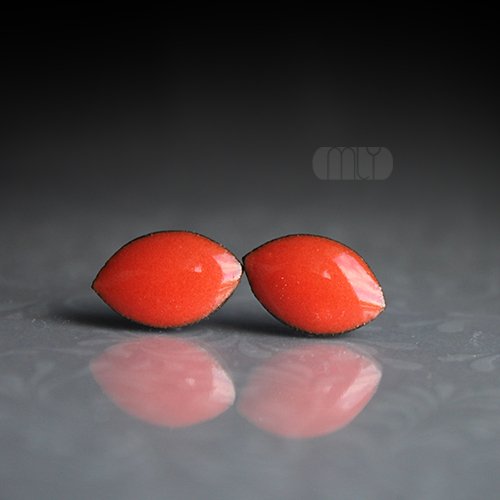 Ceramiczne kolczyki w formie sztyftów, ręcznie wykonane z delikatnej gliny kamionkowej, jednostronnie szkliwione czerwonym szkliwem z efektem plamek, na antyalergicznych sztyftach w kolorze srebrnym. Długość ok. 12mm.Polecam