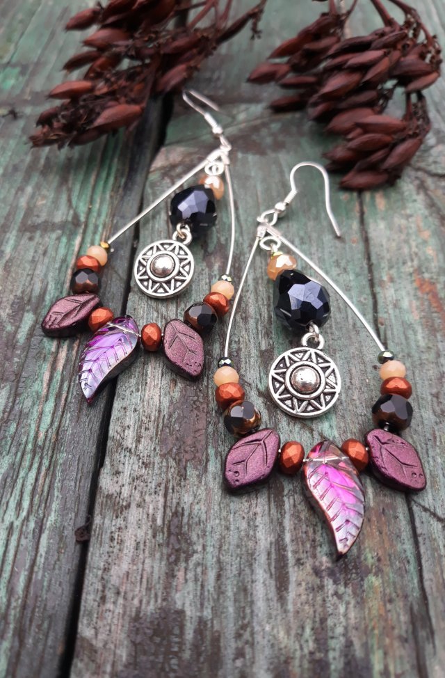 ,,listki na obręczach,, to utrzymane w jesiennej kolorystyce wiszące kolczyki wykonane ze szklanych koralików i kryształków w różnych odcieniach czerni, beżu i fioletu. Kolczyki zawieszone są na klasycznych biglach w kolorze srebrnym.