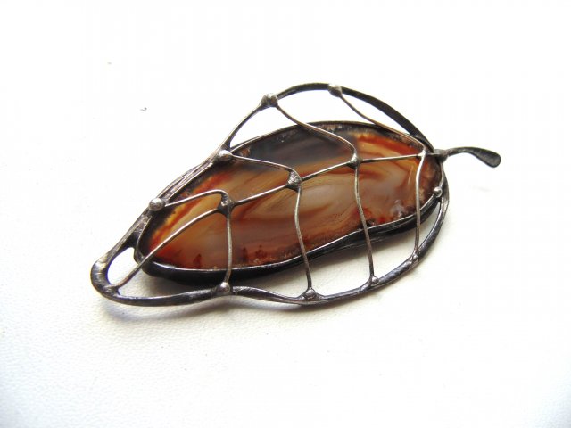 Broszka wykonana techniką witrażową z agatu. Zapięcie metalowe, z zabezpieczeniem. Wymiary ok. 8 na 4,5 cm.