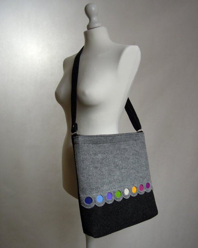 Torebka została wykonana z grubego, mocnego, impregnowanego filcu.Prosta forma, ciekawie zdobiona kolorowymi kółeczkami. Bardzo energetyczna, pasuje do wielu stylizacji. Szerokość torebki - około 32 cm, wysokość około 33 cm, głębokość - 6cm. Została wykonana z dbałością o każdy szczegół - główna komora zapinana jest na suwak. W środku 2 kieszonki na telefon. Z tyłu torebki znajduje się sporej wielkości kieszonka na suwak. Wzmocniony pasek do przewieszenia torebki przez ramię o długości około 145 cm z regulatorem długości. Gorąco polecam!