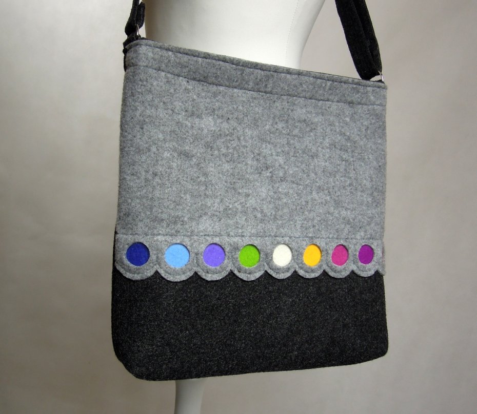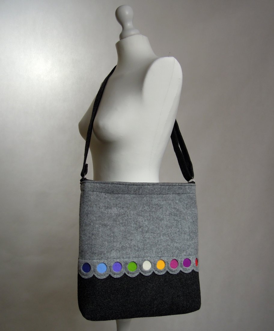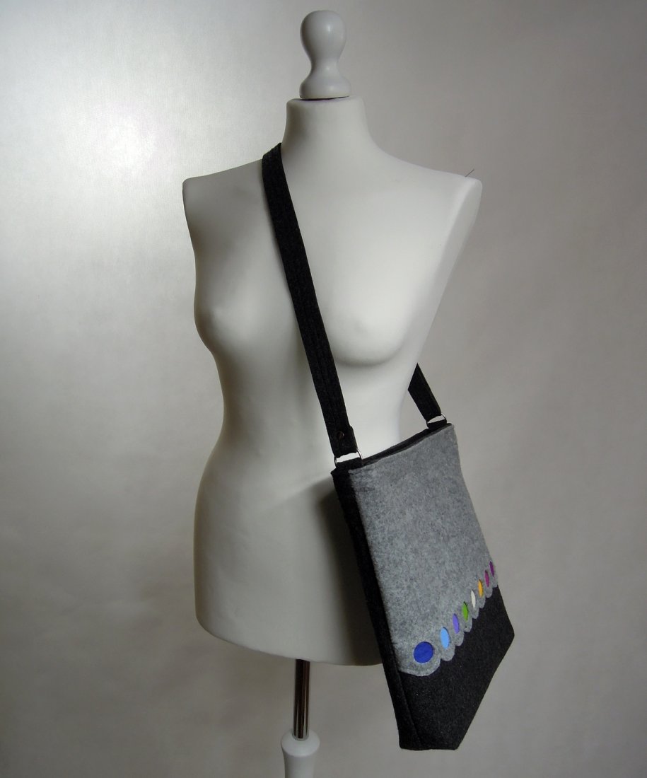 Torebka została wykonana z grubego, mocnego, impregnowanego filcu.Prosta forma, ciekawie zdobiona kolorowymi kółeczkami. Bardzo energetyczna, pasuje do wielu stylizacji. Szerokość torebki - około 32 cm, wysokość około 33 cm, głębokość - 6cm. Została wykonana z dbałością o każdy szczegół - główna komora zapinana jest na suwak. W środku 2 kieszonki na telefon. Z tyłu torebki znajduje się sporej wielkości kieszonka na suwak. Wzmocniony pasek do przewieszenia torebki przez ramię o długości około 145 cm z regulatorem długości. Gorąco polecam!