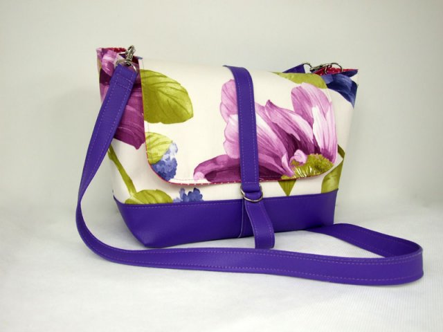 Torba listonoszka wykonana z usztywnionej bawełny w kwiaty, wykończona fioletową skórą ekologiczną. Do noszenia na ramieniu lub w ręce, pusta trzyma fason, w środku różowa podszewka w małe białe kropki i dwie kieszonki na drobiazgi. Zapinana na magnes i pasek. Wymiary: 22 cm x 28 cm