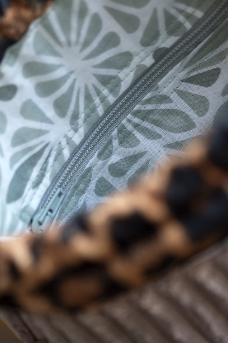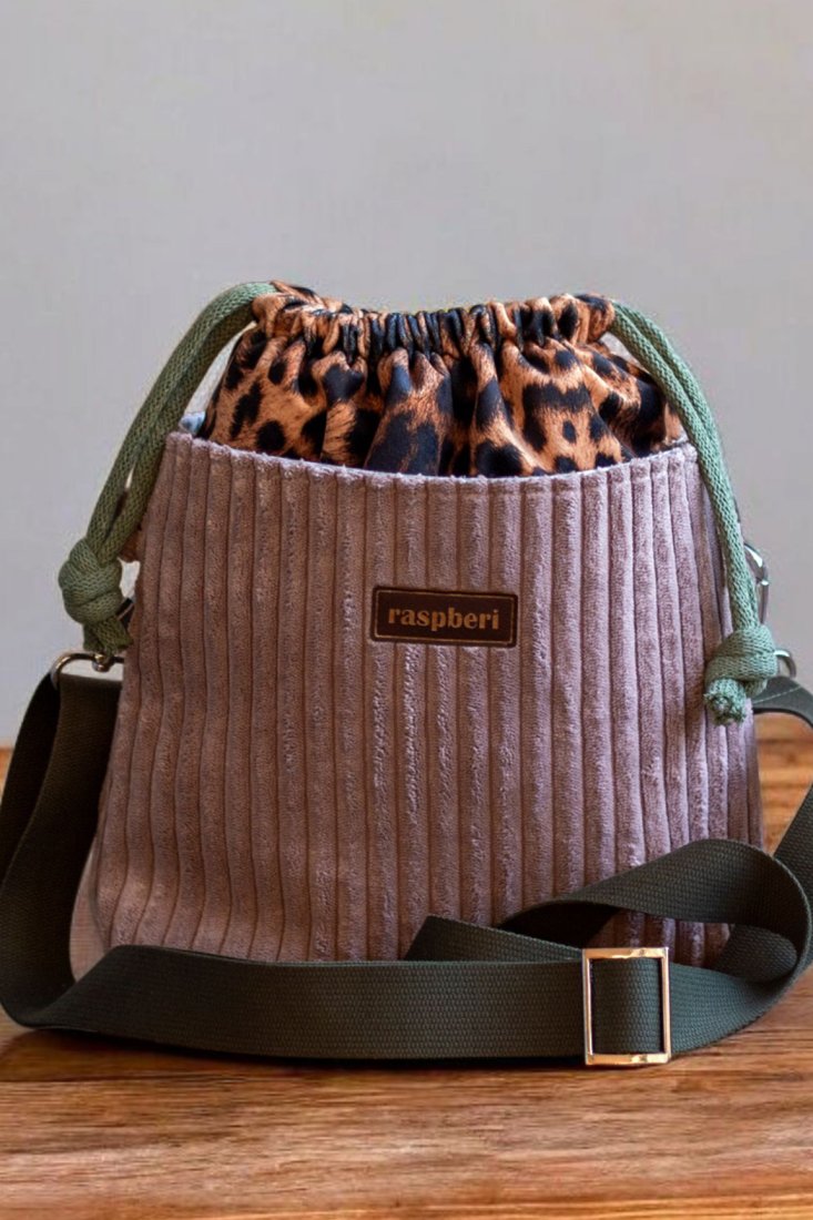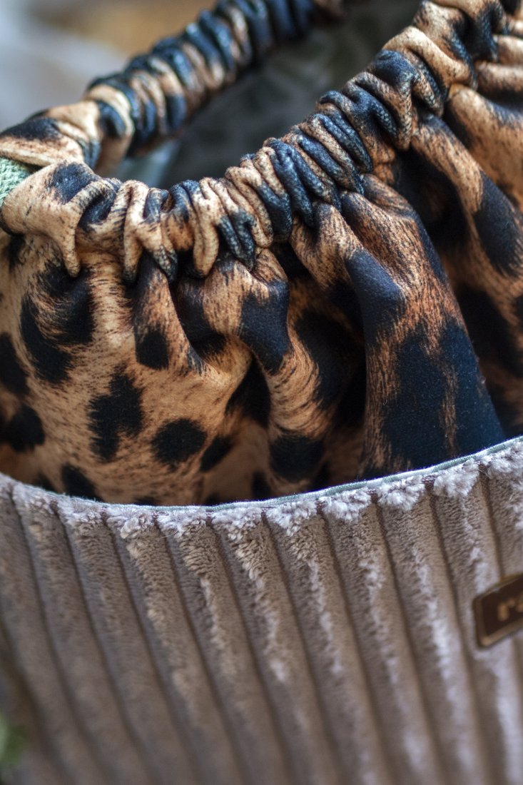 Wykonana z weluru w panterkę. Z przodu oraz z na tyle torebki kieszenie (np. na telefon czy chusteczki) z pudroworóżowego grubego sztruksu. W środku kieszonka zapinana na suwak.