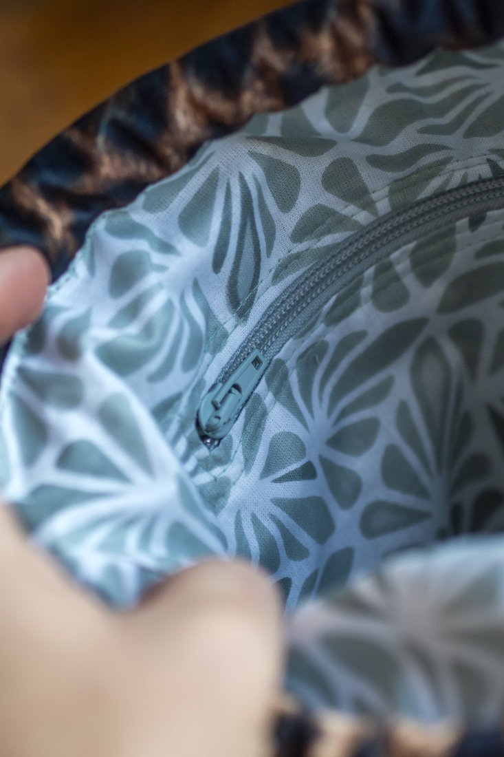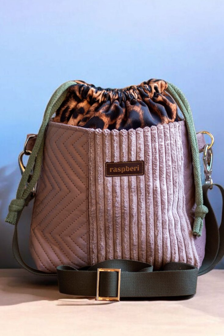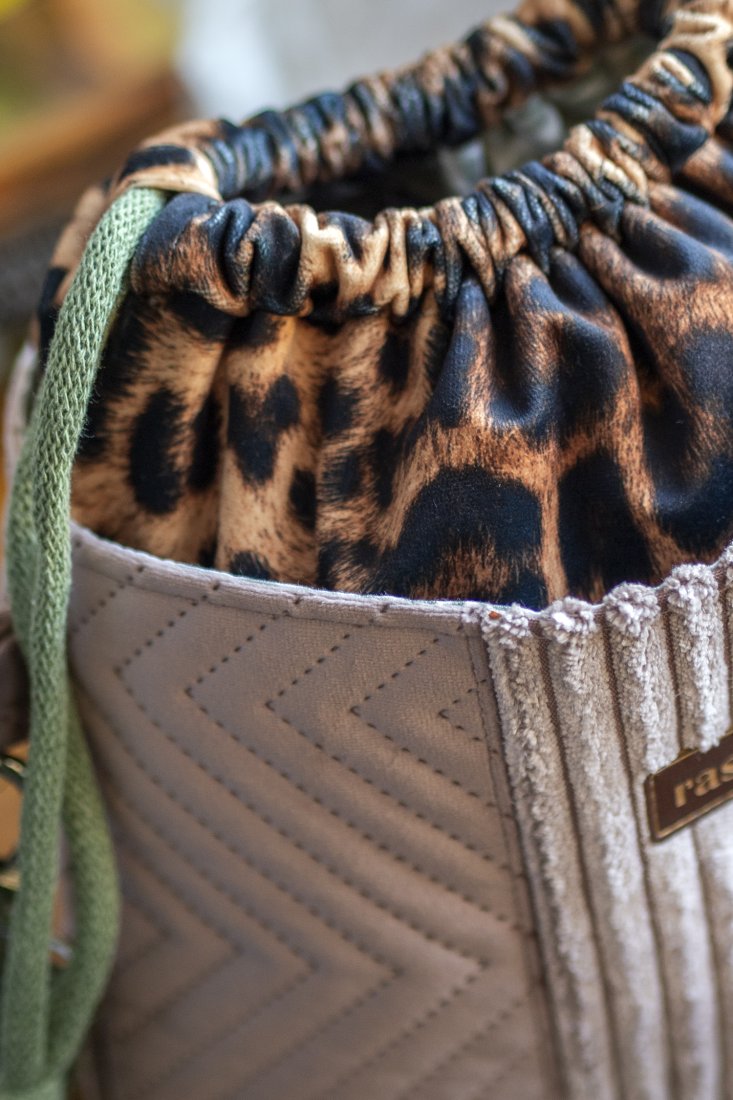 Wykonana z weluru w panterkę. Z przodu oraz z na tyle torebki kieszenie (np. na telefon czy chusteczki) z pudroworóżowego grubego sztruksu oraz pikowanego weluru. W środku kieszonka zapinana na suwak.