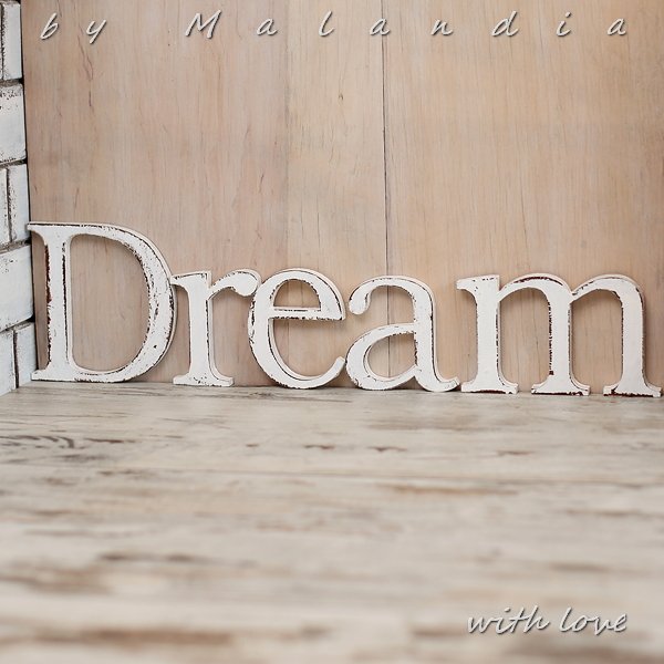 Drewniane litery Dream pomalowane metodą shabby chic, wkomponowują się w każde wnętrze, dodając mu uroku. Patrząc na nie przypominamy sobie, że warto mieć marzenia