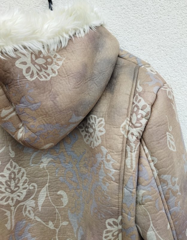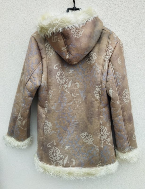 Kurtka kożuszek z zamszowej skóry ekologicznej w piękny wzór w przyjemnej beżowo- złocisto - gołębiej kolorystyce, od środka krótko strzyżone sztuczne futerko , obszycia z futerka z dłuższym włosem. Z kapturem z dwiema wpuszczanymi kieszeniami, zapinana na plastikowe kołki. Ładniejsza w realu.