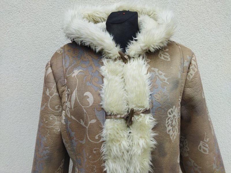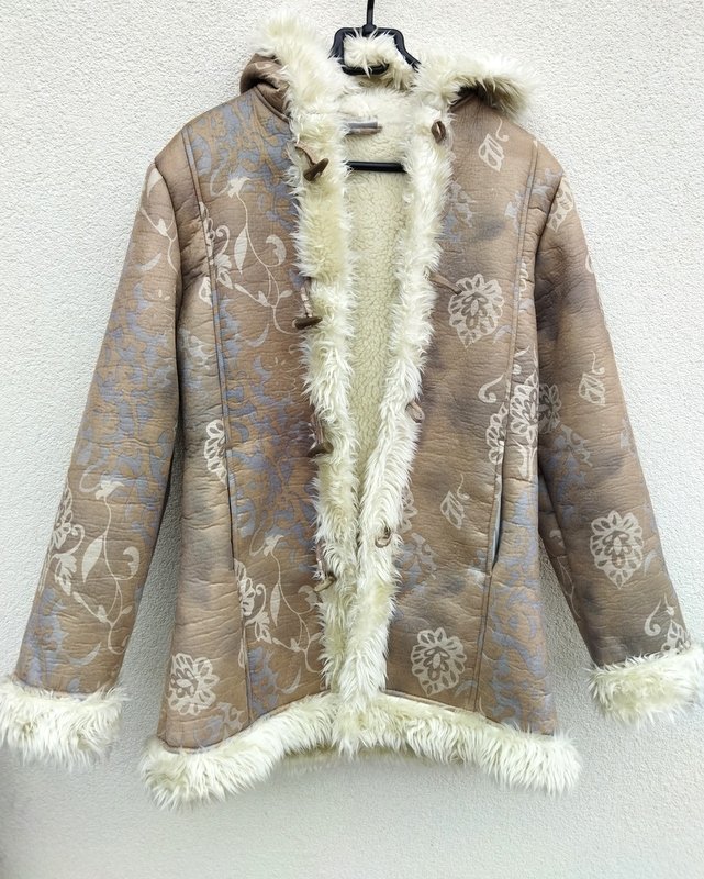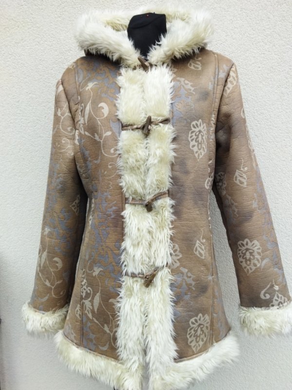 Kurtka kożuszek z zamszowej skóry ekologicznej w piękny wzór w przyjemnej beżowo- złocisto - gołębiej kolorystyce, od środka krótko strzyżone sztuczne futerko , obszycia z futerka z dłuższym włosem. Z kapturem z dwiema wpuszczanymi kieszeniami, zapinana na plastikowe kołki. Ładniejsza w realu.