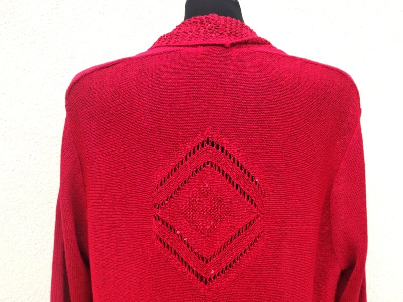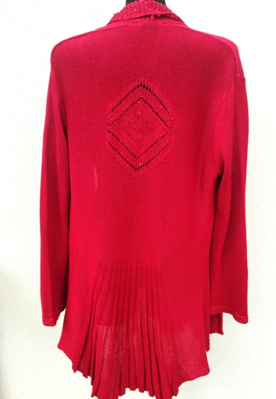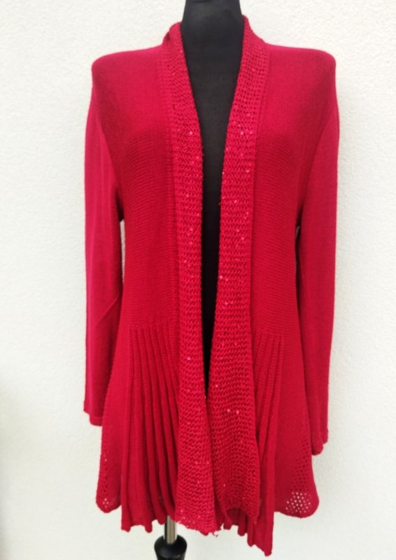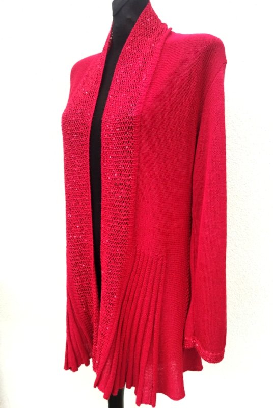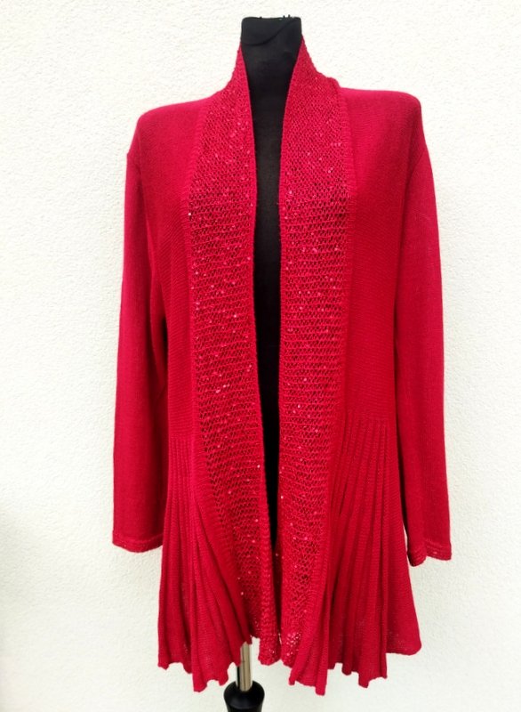 Fantazyjny sweter typu kardigan w kolorze jarzębinowej czerwieni , miejscowo z ażurowymi wzorami. Fason otwarty z szersza plisą z przodu zdobioną mikroskopijnymi cekinami w kolorze włóczki, rozkloszowany dołem