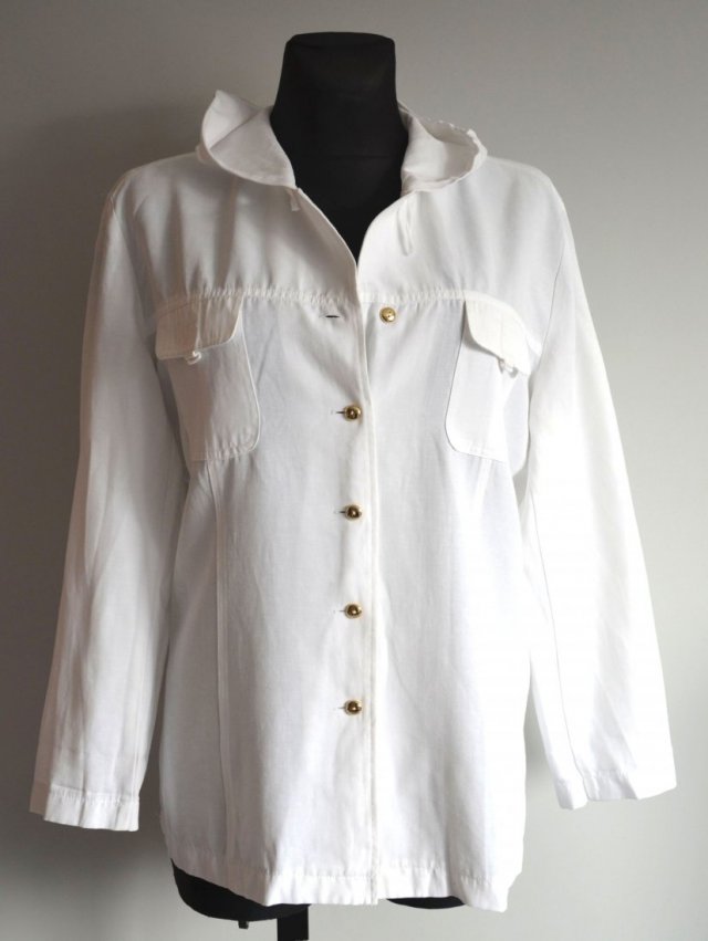 Biała bluza z kapturkiem z dodatkiem lnu. Krój prosty. Rękawy długie. Zapinana na złote guziczki. Z przodu dwie kieszonki zapinane na rzepy. Kaptur ściągany sznureczkami. U dołu, po bokach rozcięcia. Wewnątrz, na górnej części z tyłu podszewka.