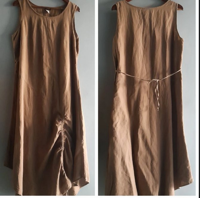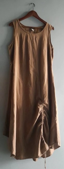 Asymetryczna długa kreatywna,można nadać fason ściągając przód, lub lużno, 55 len 45 cotton rozmiar z metki 44 dobrze wygląda też na 42, długość 114/130, pod pachami 55x2,stan bdb