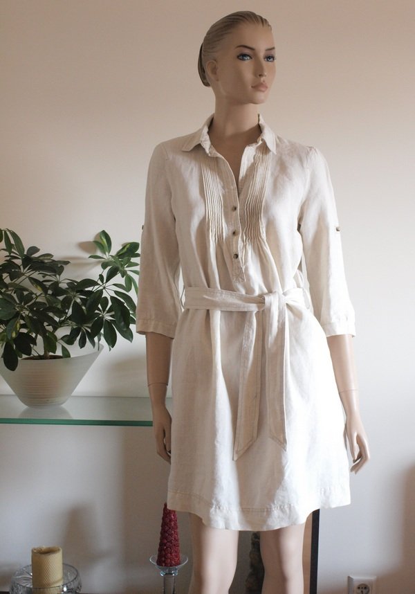 śliczna sukienka marki mango ze 100% lnu, w kolorze ecru. stan bardzo dobry. Rozmiar z metki L, na manekinie o rozmiarze 38. Ozdobne szczypanki, obszycia ciemniejszą nitką, możliwość podpięcia rękawów. powinna pasować na 38-40. Podaję wymiary mierzone na płasko;