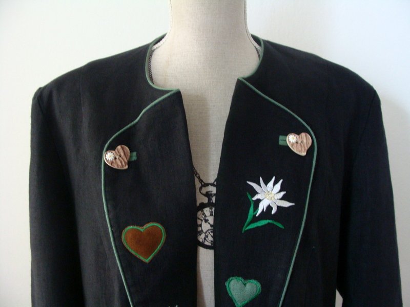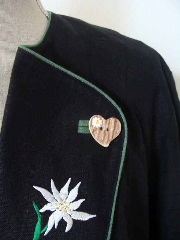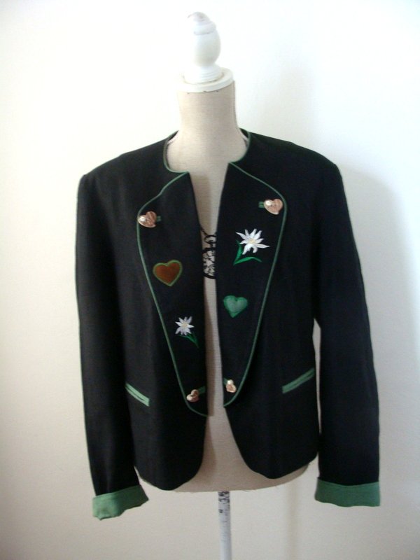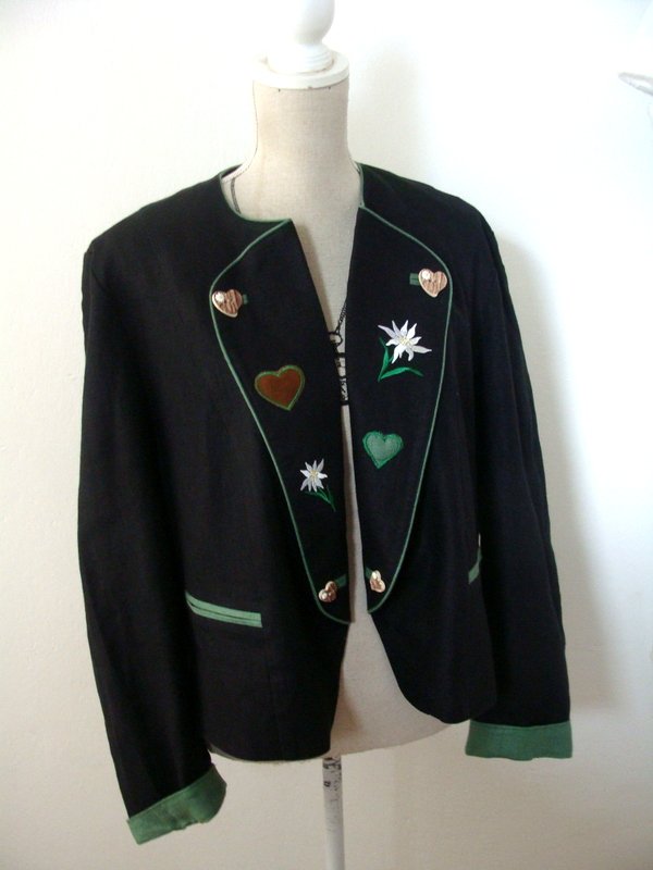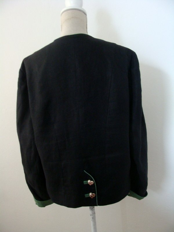 Lniana marynarka w bawarskim stylu w czarnym kolorze z zielonymi dodatkami wykończeniowymi : lamówki, odwijane mankiety, dziurki na guziki..