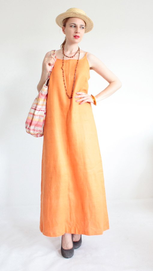Lniana, długa sukienka z regulacją obwodu z tyłu.