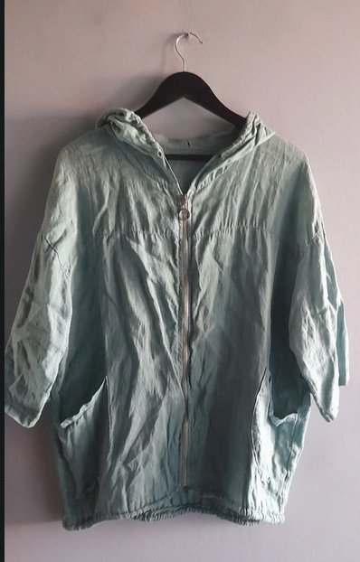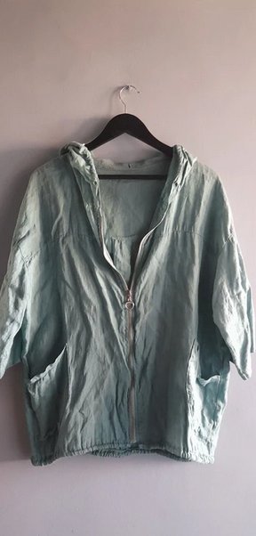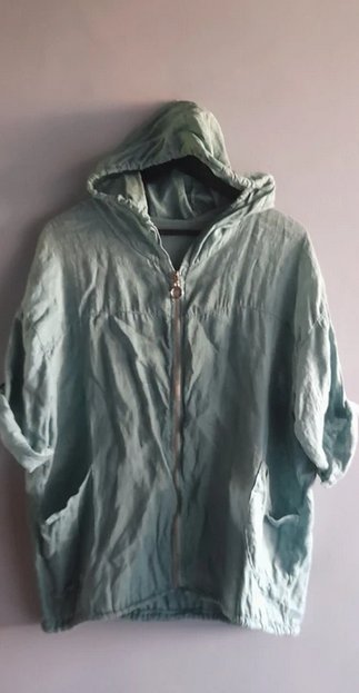 Oversizowa lniana miętowa katana z kapturem zapinana na zamek stan bdb długość 70 szerokość 68x2 w realu kolor intensywniejszy