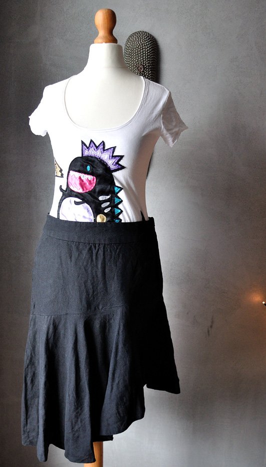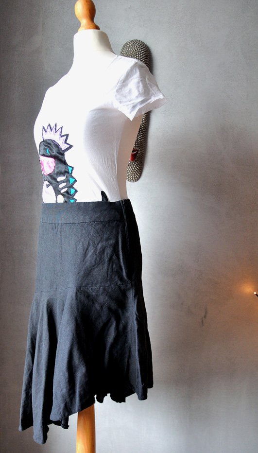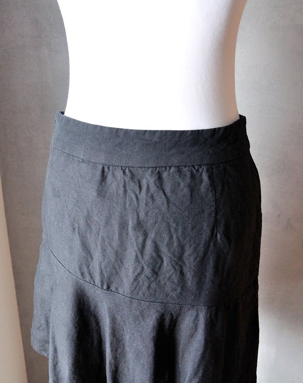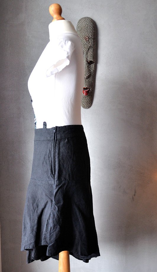 Świetna spódnica uszyta z czarnego, niezbyt grubego, ale dość sztywnego lnu. Marki H&M, ale pochodzi z czasów, kiedy te ubrania były całkiem niezłej jakości. Kolor jest ciemniejszy, niż na zdjęciach (zdjęcia są nieco bardziej rozjaśnione, żeby uwydatnić krój).