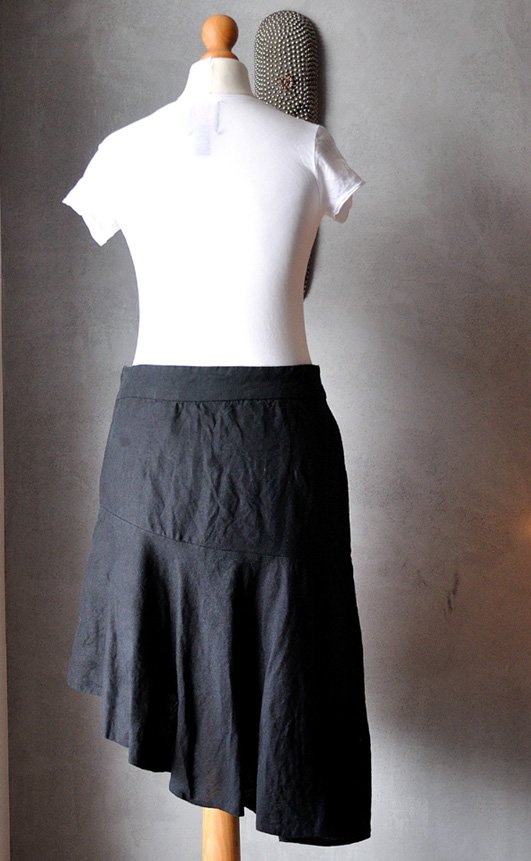 Świetna spódnica uszyta z czarnego, niezbyt grubego, ale dość sztywnego lnu. Marki H&M, ale pochodzi z czasów, kiedy te ubrania były całkiem niezłej jakości. Kolor jest ciemniejszy, niż na zdjęciach (zdjęcia są nieco bardziej rozjaśnione, żeby uwydatnić krój).