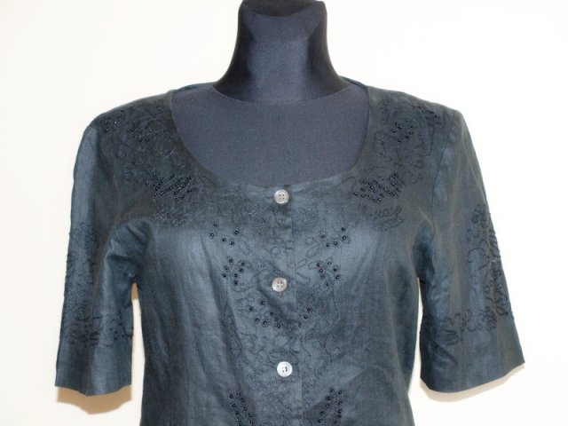 Czarna bluzeczka, ze 100% lnu . Marka Wallis exclusive. Piękny dekolt, talia modelowana cięciami. Na przodzie i rękawach hafty i koraliki. Ładny, wąski rękawek do łokcia. Rozmiar 10, na manekinie 38. Stan bardzo dobry, jak nowa. Podaję wymiary mierzone na płasko;