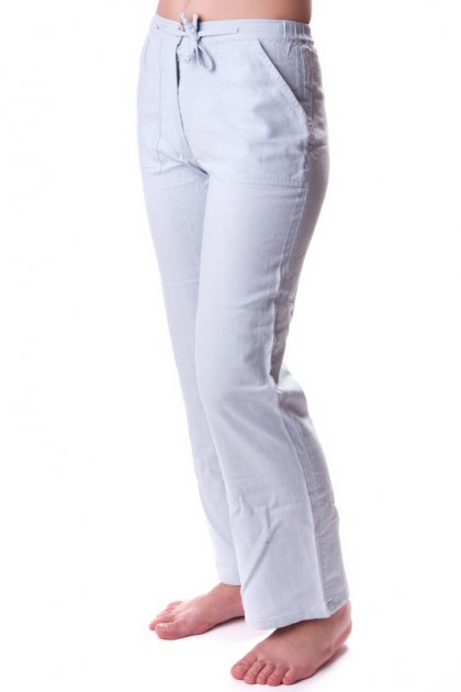 Spodnie w kolorze jasno niebieskim. Materiał: 55%len, 45%wiskoza. Rozmiar na metce S. Zapinane na zamek błyskawiczny i guzik. 2kieszenie. W talii krótki sznurek do przewiązywania.Wymiary to ok. szerokość (mierzona w talii, bez rozciągania gumek wszytych z boku materiału) ok. 34cmx2, długość ok. 95cm. Stan: bardzo dobry! Polecam.