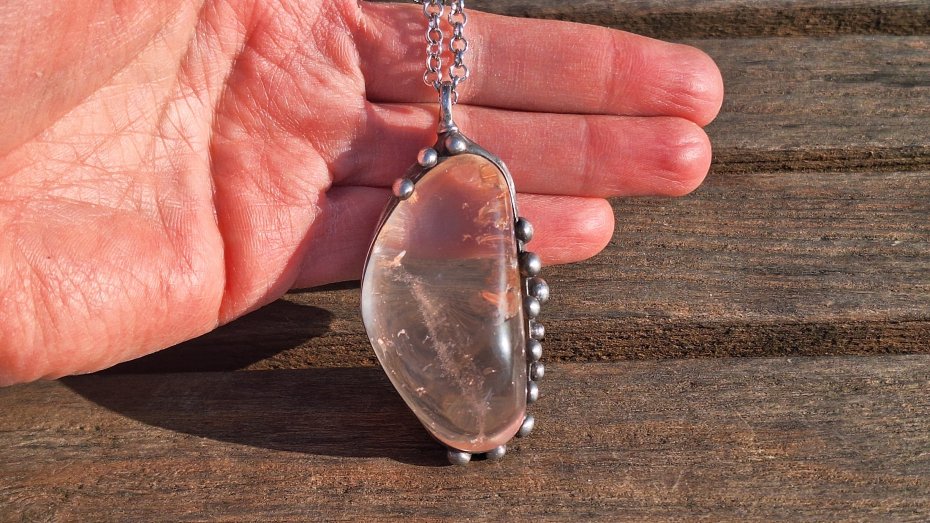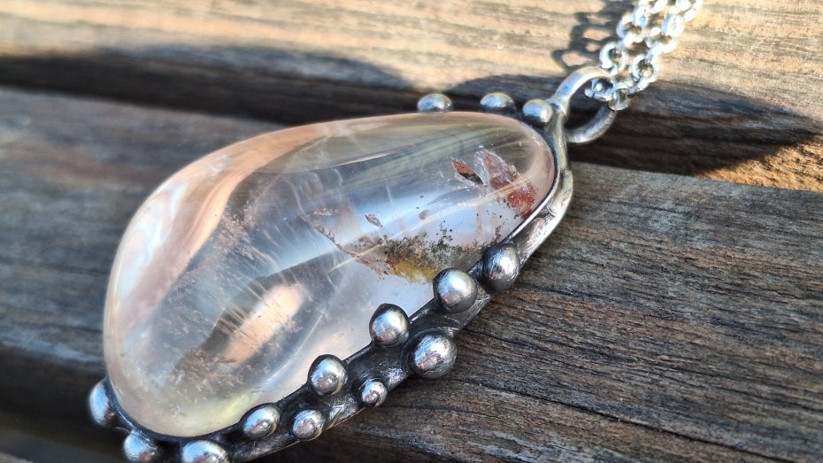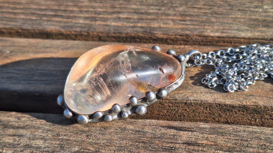 Wisiorek wykonany z miedzi, cyny i kryształu górskiego z chlorytem. Wymiary ok. 5.5 na 3 cm. Zawieszony na łańcuszku o długości ok. 50 cm.