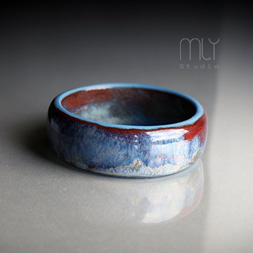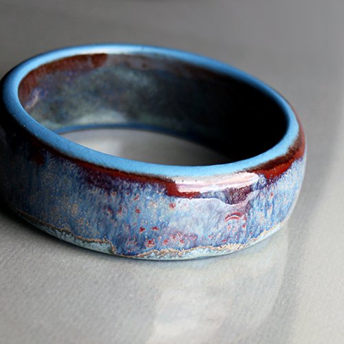 Efektowna, lekko nieregularna, ceramiczna bransoletka ręcznie wykonana najwyższej jakości porcelany, barwionej niejednorodnie na odcienie błękitu, szkliwiona mieszanką błękitnych i czerwonych szkliw z efektem plamek Średnica wewnętrzna około 6,5cm, szerokość około 2,5cm, grubość około 8mm.WYKONYWANA NA ZAMÓWIENIE - czas realizacji 10-14dni Polecam