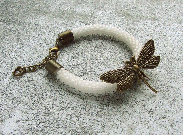 Bransoletka wykonana pracochłonną techniką sznurów szydełkowych z oszronionych drobnych białych koralików Toho przypominających małe kryształki lodu z przekładką ważką. Długość bransoletki 16,5 cm + 5 cm łańcuszka, ważka jest ruchoma, można ją przesuwać w dowolne miejsce bransoletki