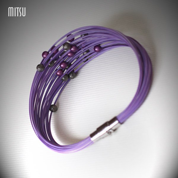 Bransoleta borówkowa :-) zbudowana ze stalowej linki pokrytej nylonem, o pastelowej fioletowej barwie. Linka jest nierównomiernie zabarwiona przetykana bielą co daje jej przestrzeń w tonacji. Na lince mnówstwo drobnych koralików wielkości 4 mm w pieknie odbijającym światło fiolecie, oraz w kolorze oksydowanego srebra - kulki metalowe teksturowane. Bransoleta jest zapianana na magnes i blokadę. Wielkość: 18 cm. Podróżuje ładnie zapakowana.