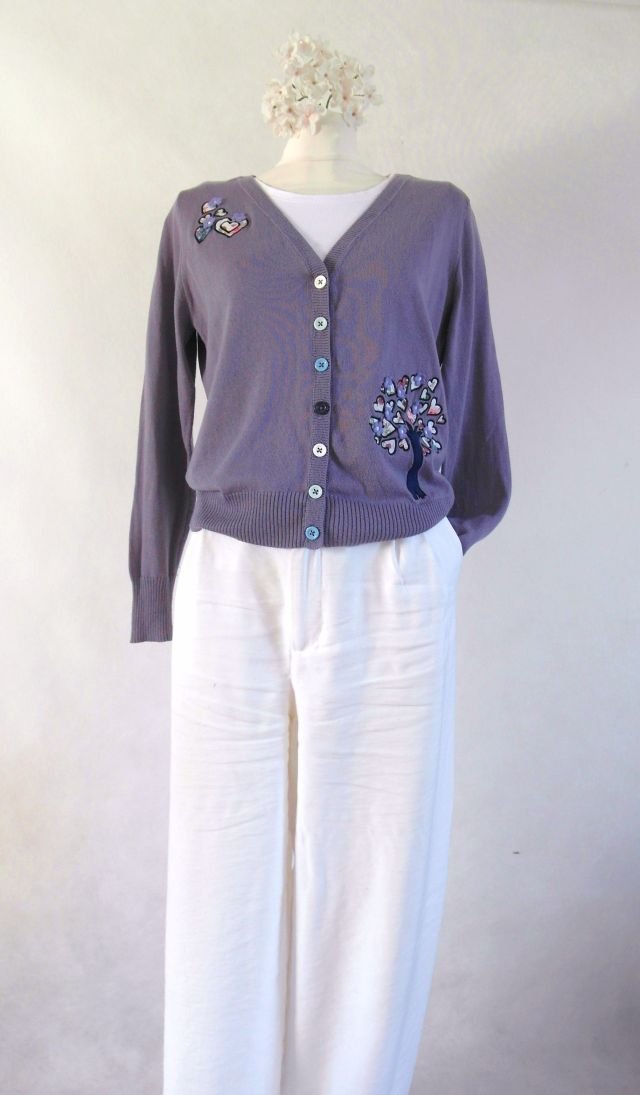bardzo ciekawy kolor - stonowany, pastelowy ciemny fiolet - takie właśnie lody jagodowe.kolorowe guziki oraz aplikacja drzewa pełnego serduszek a przy dekolcie same serduszka :-)
