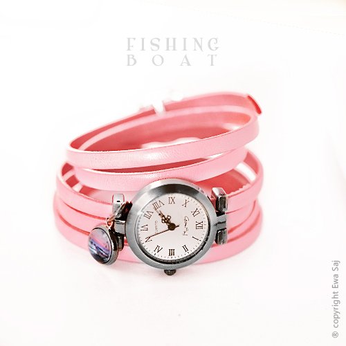 Oryginalna bransoletka - zegarek z kolekcji Łódź rybacka. Skórzany rzemyk w kolorze różowym szeroki na 5 mm sześciokrotnie owija nadgarstek. Zapięcie umożliwia regulację szerokości. Pasuje na nadgarstek 13-17 cm. Wielkość tarczy zegarka 25 mm, średnica charmsa 12 mm. Charms i zegarek w kolorze antycznego srebra.