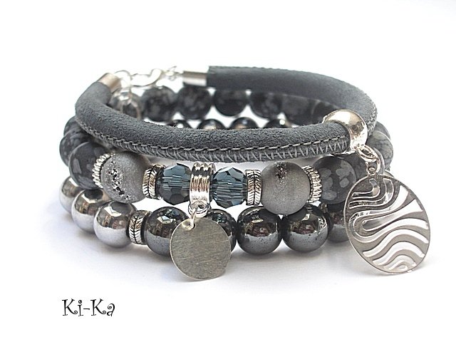 Komplet trzech bransoletek wykonany z naturalnych kamieni - obsydian matowy [10 mm], agaty z naturalnymi druzami pokrytymi tytanem [10mm], hematyty [10mm], kryształków fasetowanych [8mm], rzemienia z naturalnej, cielęcej skórki [śr. 6mm] oraz elementów metalowych w kolorze srebra. Bransoletki z kamieni na gumce silikonowej. Pasują na nadgarstek 16-17cm. Biżuteria ozdobnie zapakowana