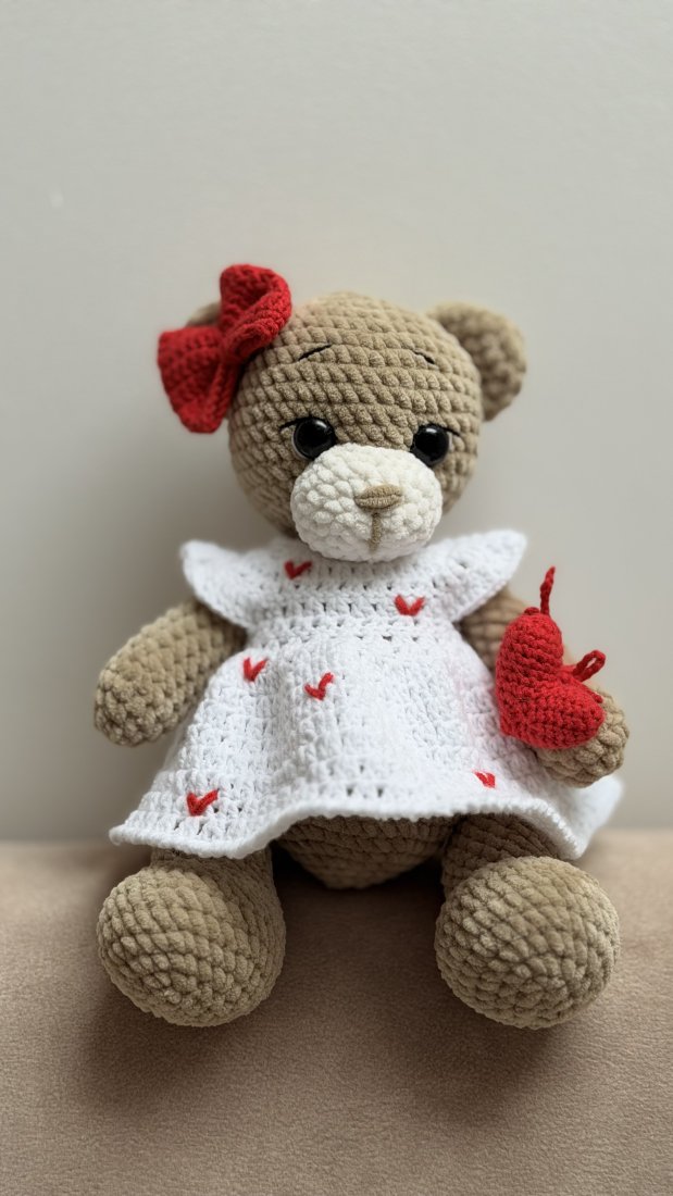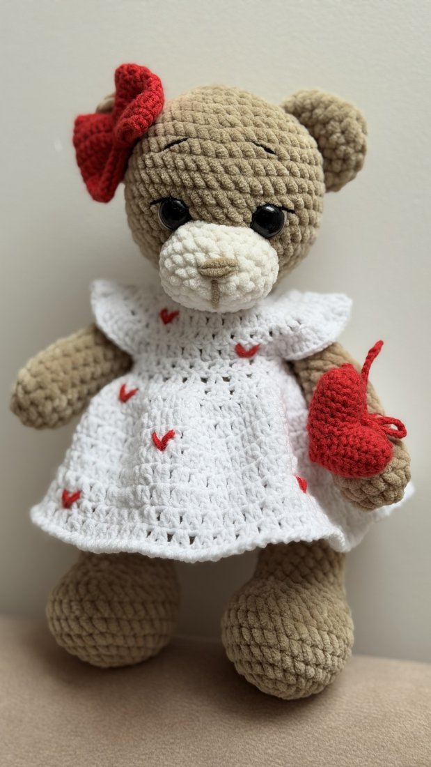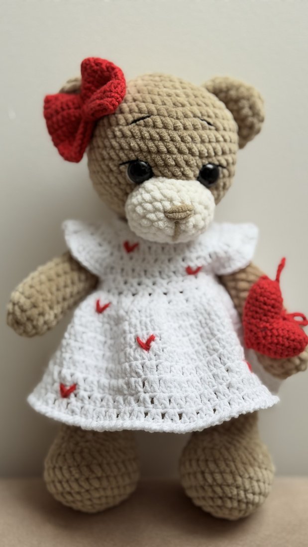 Uroczy miś szydełkowy jak z bajki, stworzony do przytulania i wywoływania uśmiechu. Ma łagodne spojrzenie, mięciutkie łapki i delikatny urok, który sprawia, że od razu kradnie serce. Biała sukienka z czerwonymi serduszkami, czerwona kokardka przy uszku i wiązane serduszko w rączce dodają mu wyjątkowej, ciepłej osobowości.