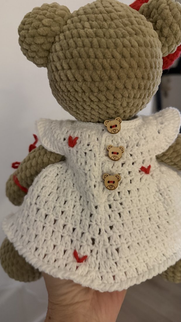 Miś ma około 30 cm wysokości. Wykonany ręcznie z pluszowej włóczki Himalaya Dolphin Baby z certyfikatem OEKO-TEX Standard 100. Sukienka, kokardka i serduszko z bawełnianej włóczki YarnArt. Sukienka jest zdejmowana i zapinana z tyłu na drewniane guziczki w kształcie misiów. Oczka osadzone stabilnie, wypełnienie z certyfikowanej kulki silikonowej. Produkt polski, 100 procent handmade, kolekcjonerski.