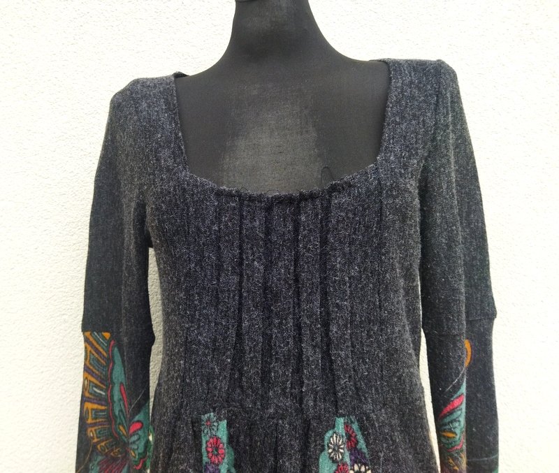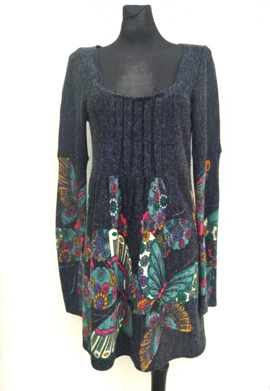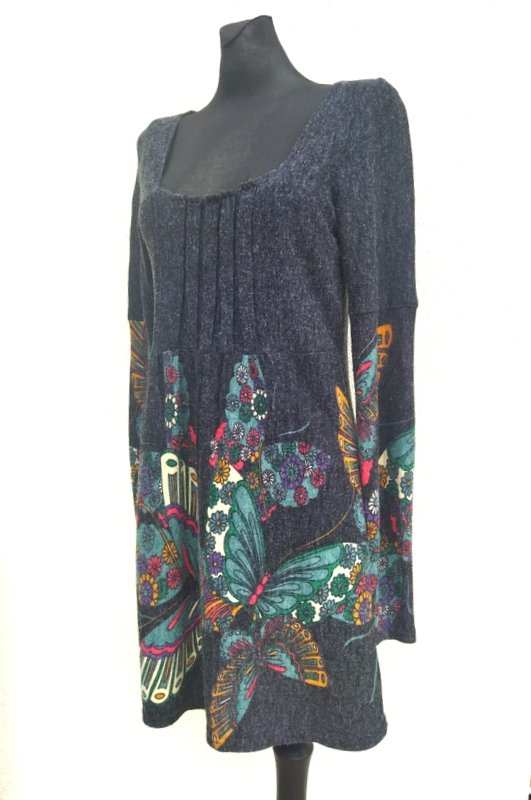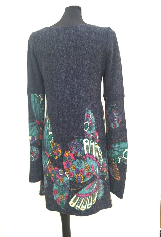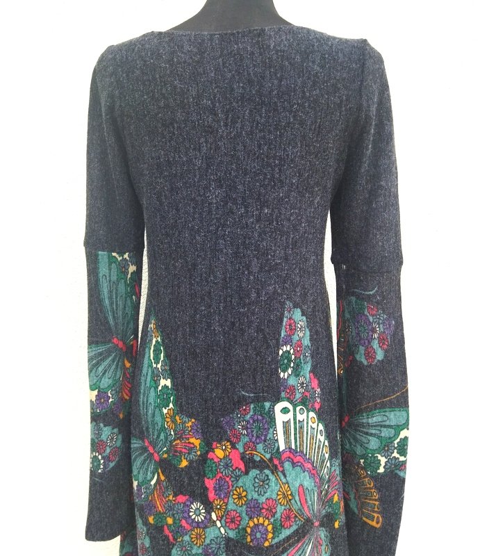 Wzorzysta sukienka z dzianinowej tkaniny z kutnerem w melanżowym ciemnoszarym kolorze z wzorem w kwiaty i motyle w kolorach odcieni zieleni, czerwieni , miodowej żółci, i fioletu. Góra z małymi kontrafałdkami dół leko marszczony w części środkowej przodu. Bez podszewki.
