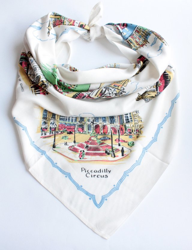 Duża chusta w londyńskie motywy uszyta prawdopodobnie z wiskozy.
