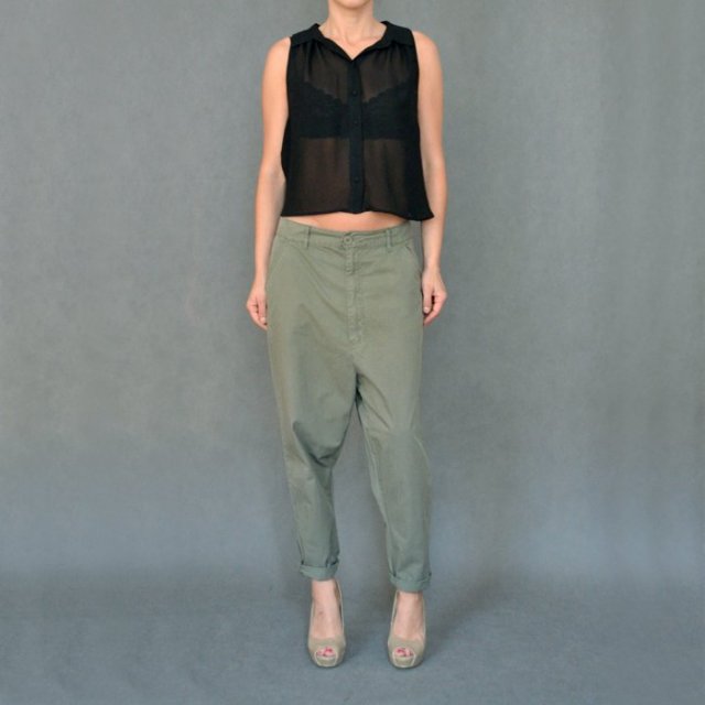 Świetne spodnie w kolorze khaki z obniżonym stanem. Model LOOSE HAREM. Marka BIK BOK.