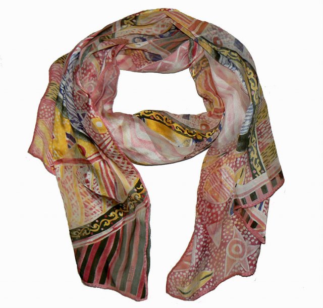 Szal od projektanta w barwne wzory. Lekki i zwiewny. Rolowane brzegi.