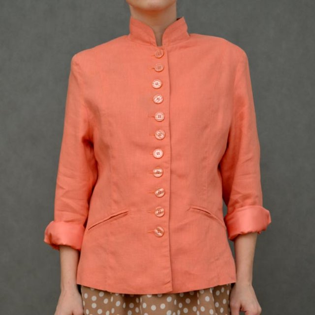 Świetny wiosenny żakiet w mocnym, łososiowym kolorze. Wykonany w 100% z lnu. Zapinany na rząd guzików, można postawić super stójkę. Po bokach kieszonki jeszcze nie rozprute. Na podszewce. Polecam bardzo.