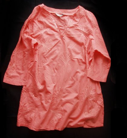 Przewiewna bluzka, tunika w kolorze łososiowym, zdobiona haftem oraz cekinami, styl indyjski. Rozmiar z metki 46, ale spokojnie może byc XL, XXL.Stan bardzo dobry, jak nowa. Marka New Look.